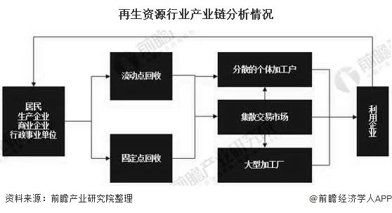 随着再生资源市场的逐步放开,我国已形成了从产生源经固定收购点、流动收购点、拾荒者、资源加工企业等层层筛选、分类,最终到达利用企业的完整流程,产业链如下图所示: